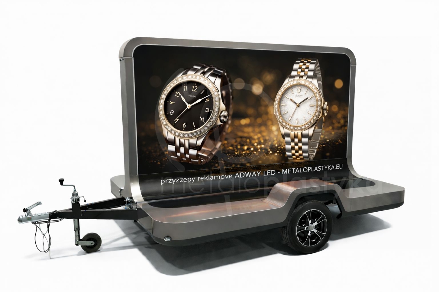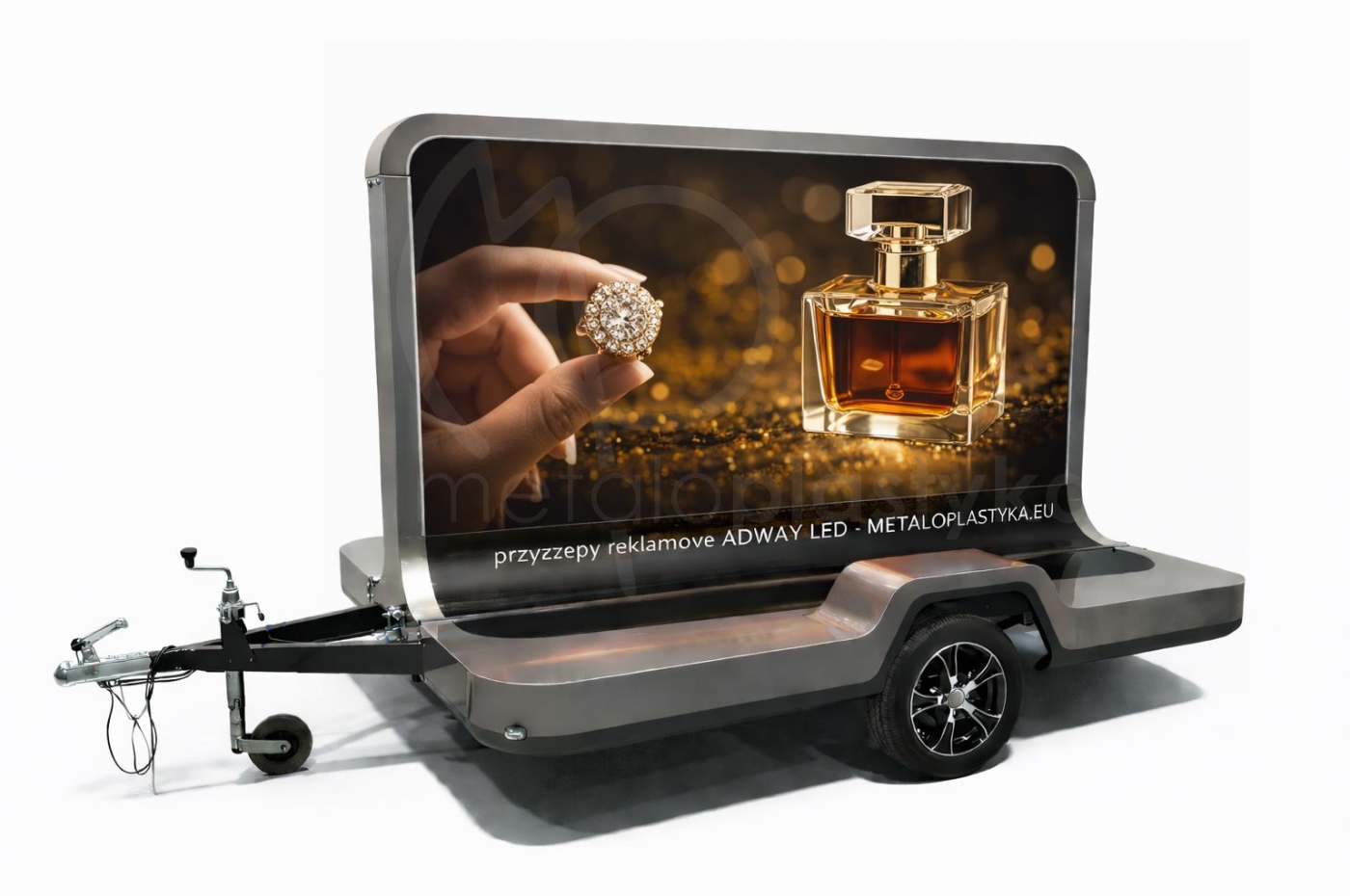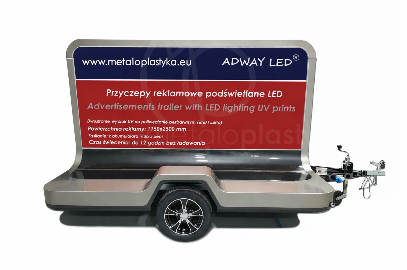 Jeśli poszukujesz przyczepy reklamowej dla marki premium i chciałbyś ją zaprezentować w sposób ekskluzywny, to przyczepa reklamowa ADWAY LED Metaloplastyka jest dla Ciebie. Oferujemy zaprojektowaną przyczepę reklamową podświetlaną LED ], z obustronną grafiką ze specjalnym rodzajem druku, idealnie odwzorowującym kolory po podświetleniu (bez efektu "wypłowiałych kolorów"). Grafika jest wymienna, czyli po kampanii reklamowe bądź informacyjnej jest możliwość łatwej wymiany.