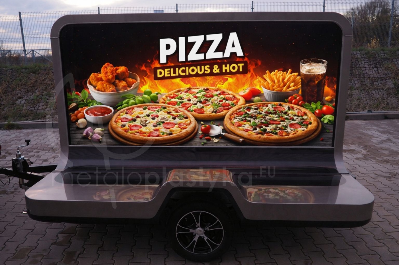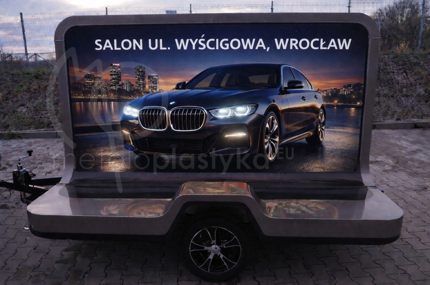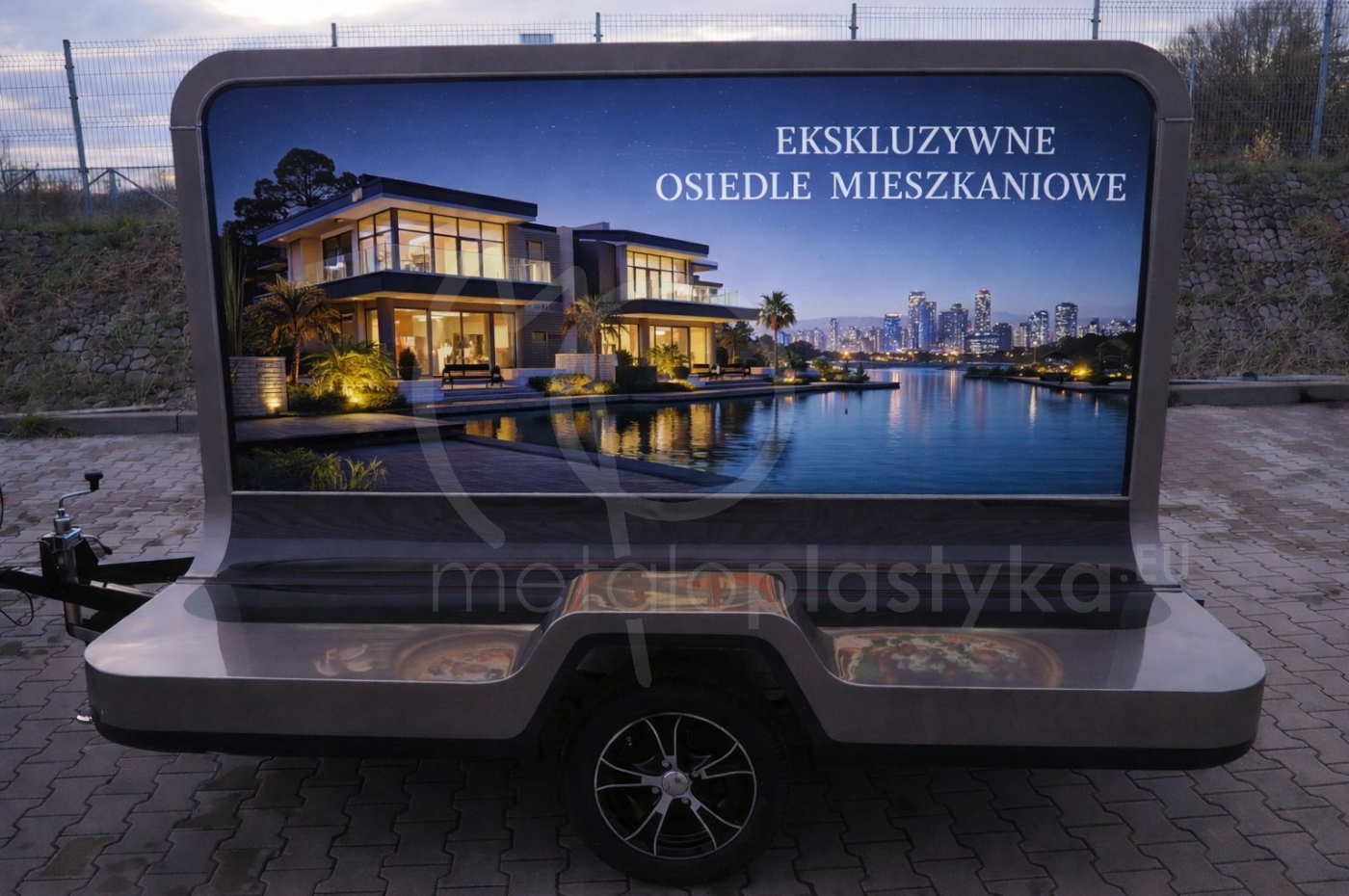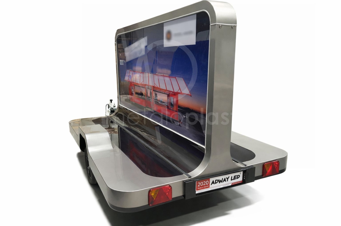 Jeśli poszukujesz przyczepy reklamowej dla marki premium i chciałbyś ją zaprezentować w sposób ekskluzywny, to przyczepa reklamowa ADWAY LED Metaloplastyka jest dla Ciebie. Oferujemy zaprojektowaną przyczepę reklamową podświetlaną LED ], z obustronną grafiką ze specjalnym rodzajem druku, idealnie odwzorowującym kolory po podświetleniu (bez efektu "wypłowiałych kolorów"). Grafika jest wymienna, czyli po kampanii reklamowe bądź informacyjnej jest możliwość łatwej wymiany.