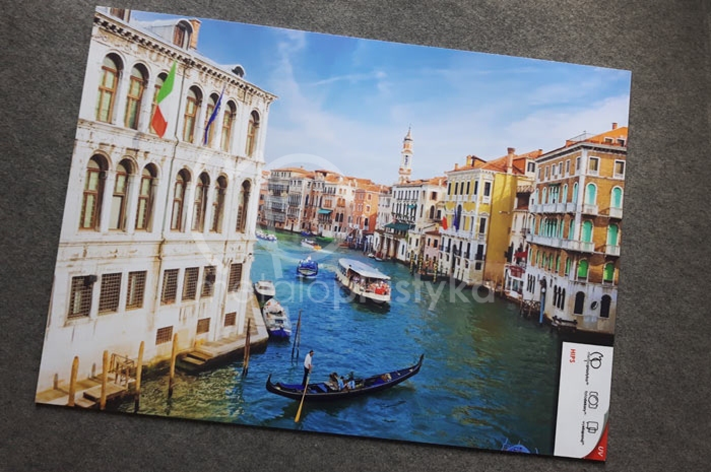 Wydruk UV na płycie HIPS (wysokoudarowe, utwardzane PVC z powłoką białą błyszczącą).