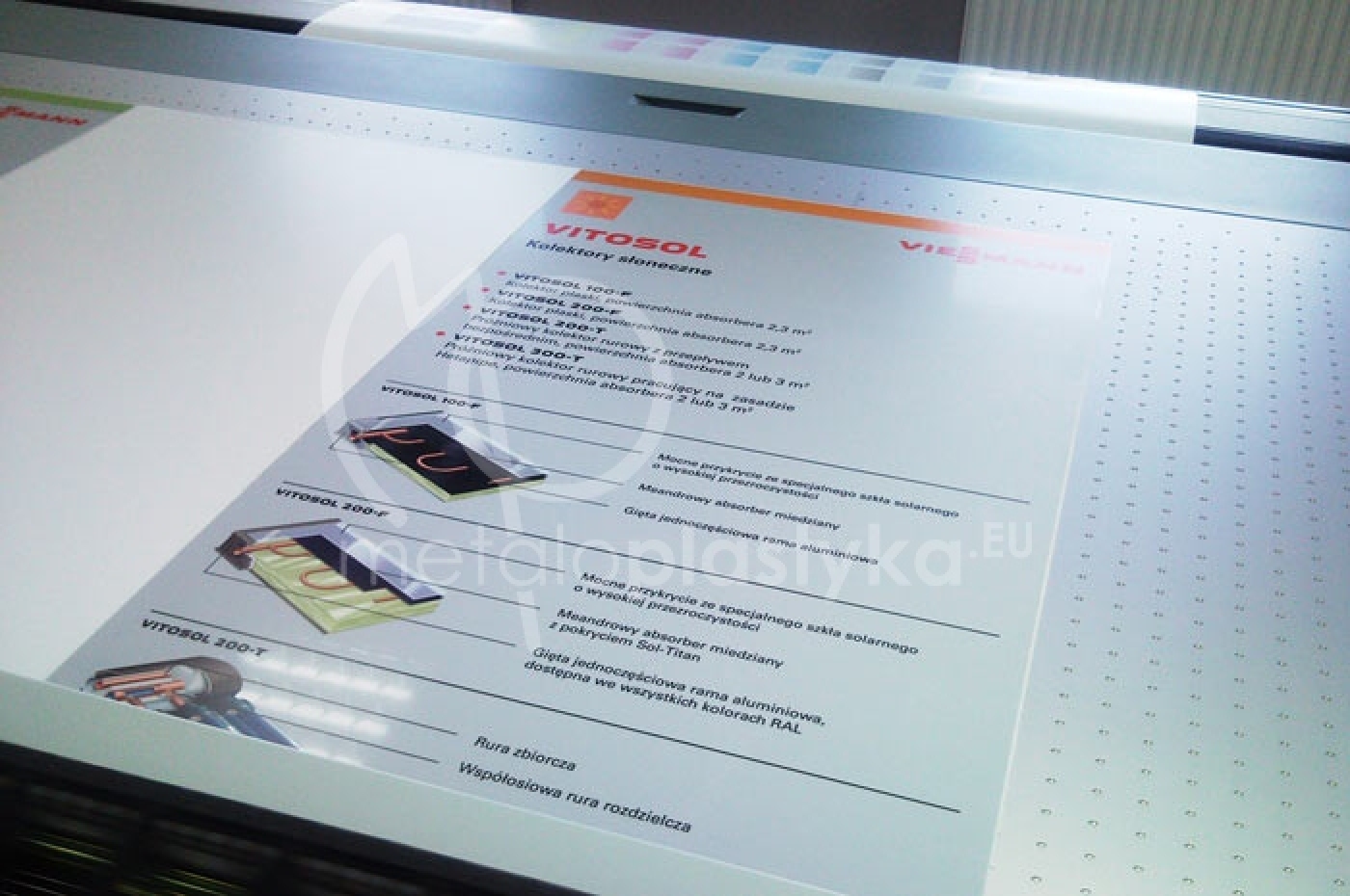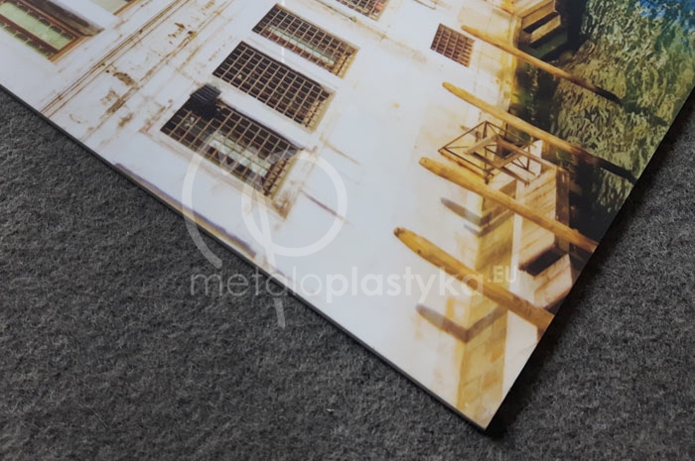 Wydruki bezpośrednio na powierzchni płyty pozwalają osiągnąć wysokie wysycenie kolorów, połysk osiągany jest w miejscach w których występuje biel w pliku.