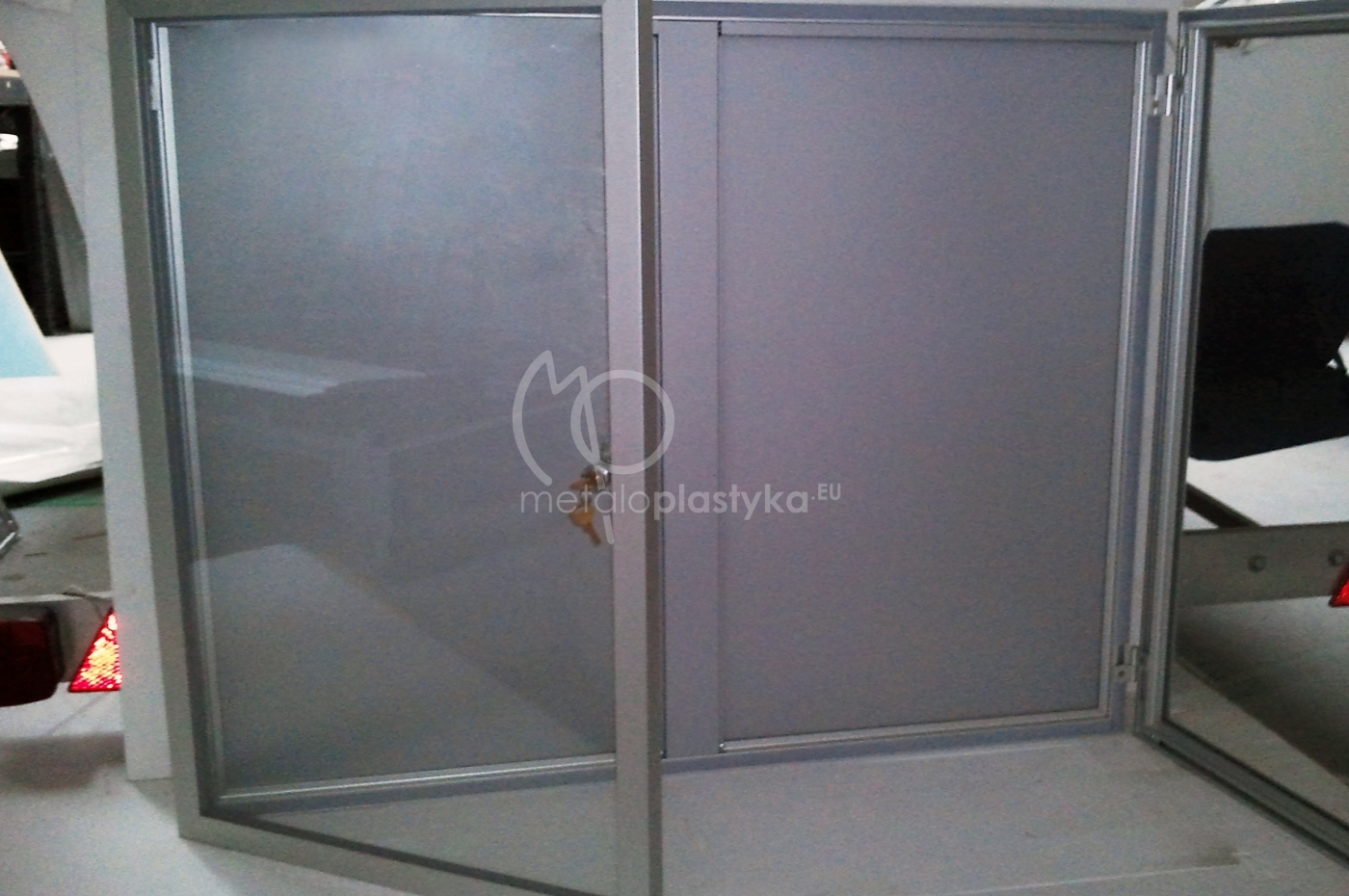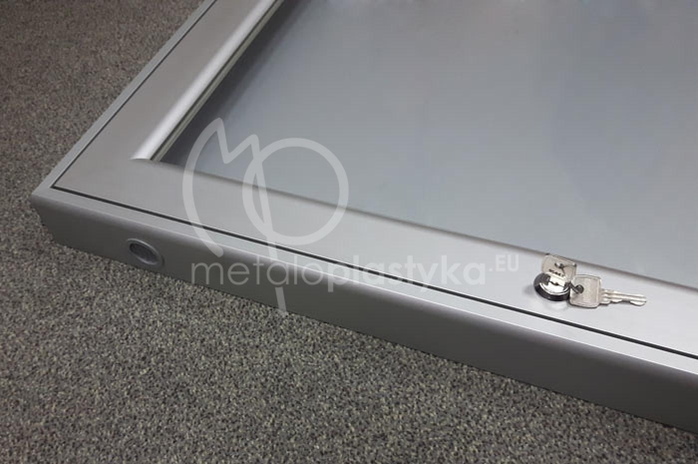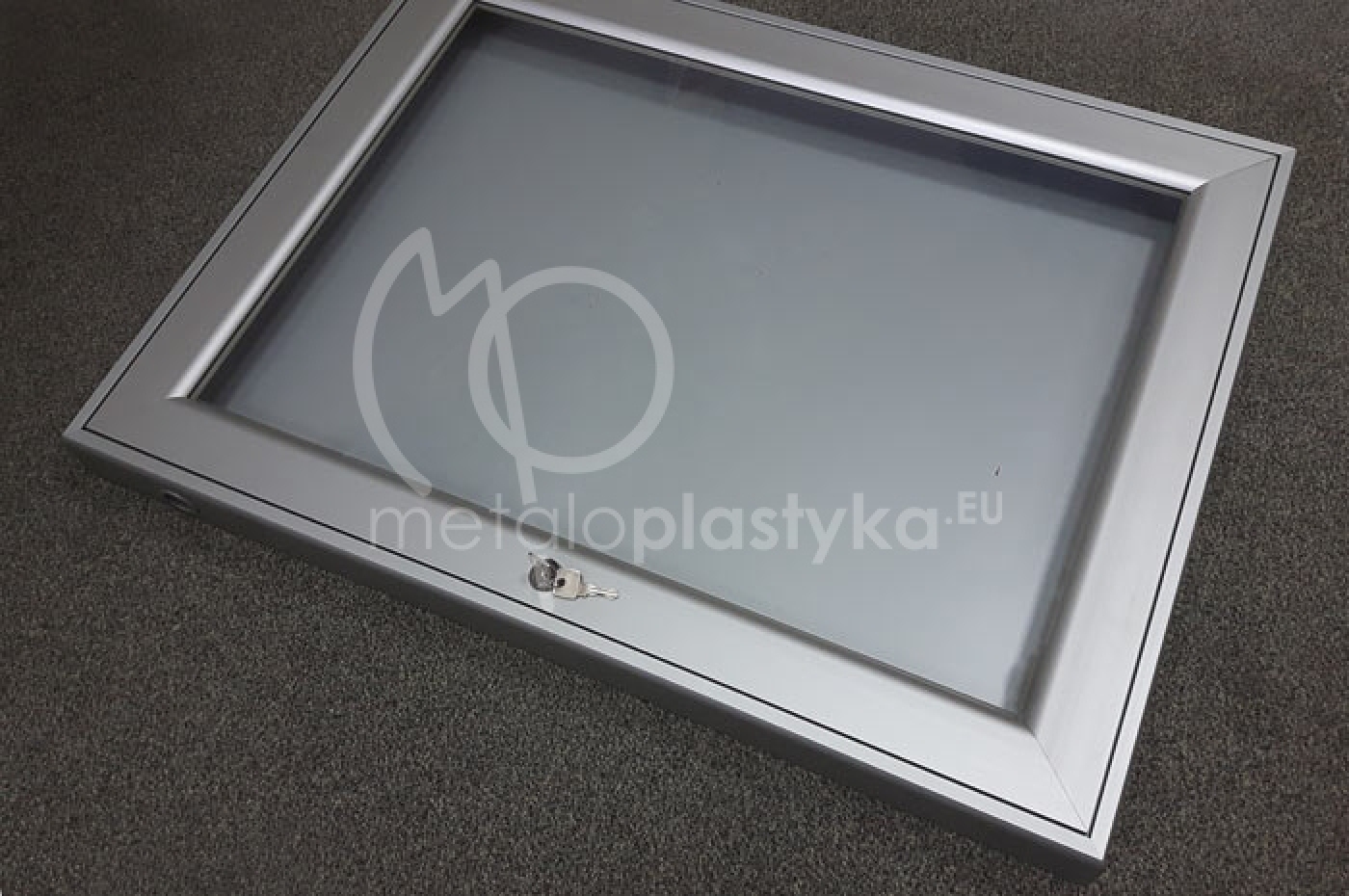 Gablota informacyjna z profili anodowanych srebrnych, z plecami z blachy magnetycznej lub tworzywa, lico drzwi przeszklone lub wypełnione poliwęglanem litym bezbarwnym. Gabloty otwierane do góry lub na bok, z drzwiami pojedynczymi lub podówjnymi. Wymiary dopasowane do potrzeb lub według podanych standardów.