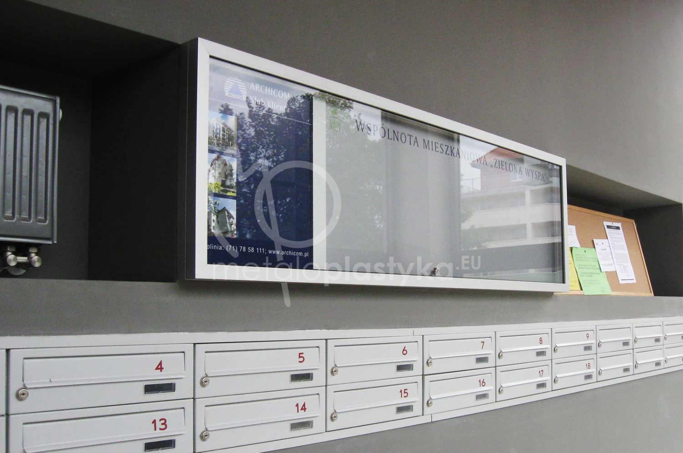 - montowana na ścianie (ukryte kołki w ramie gabloty)