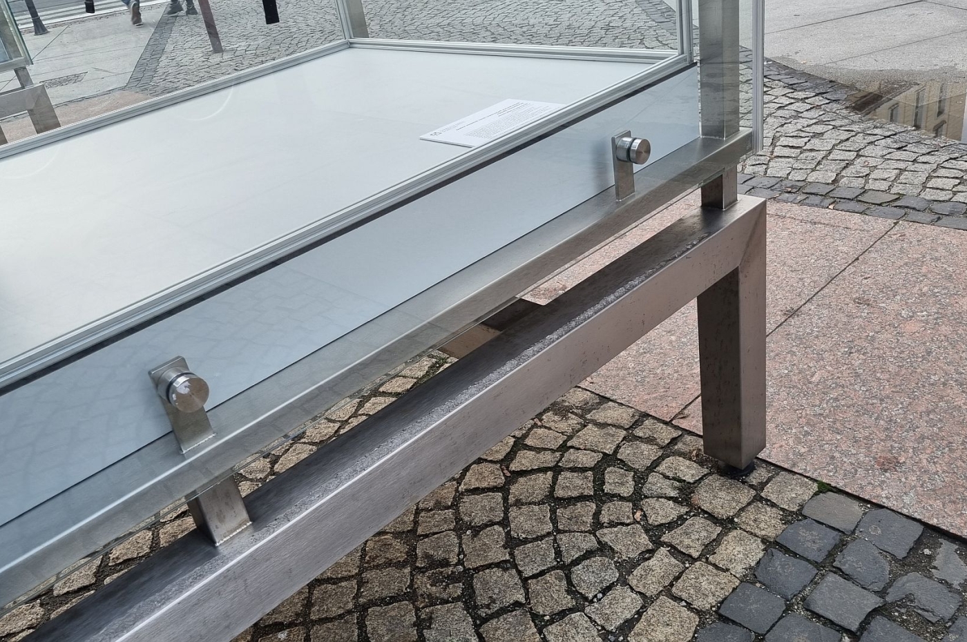 Jest to gablota wystawiennicza przenośna wykonana z profili stalowych nierdzewnych, szkła hartowanego, corianu, płyt HPL, elementów aluminiowych oraz zaopatrzona w oświetlenie i panele fotowoltaicznego z akumulatorami i zegarem astronomicznym wg projektu autorów z ASP we Wrocławiu.