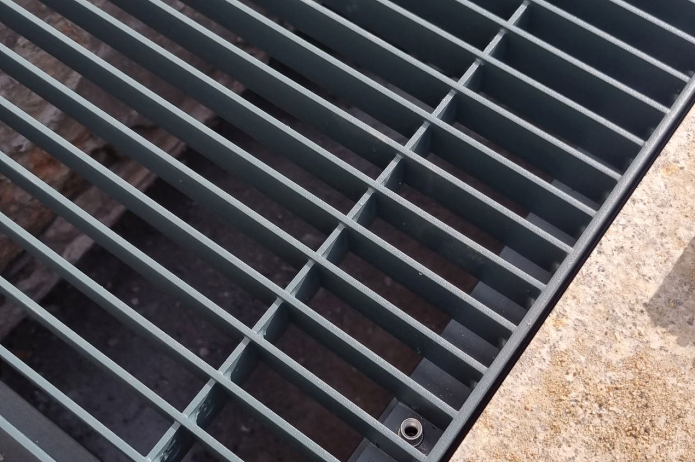 - Kratownica ze stali cięta laserowo w ramie z kątownika stalowego, montowana na solidne śruby zabezpieczające przed przypadkowym wyjęciem oraz z regulacja poziomu