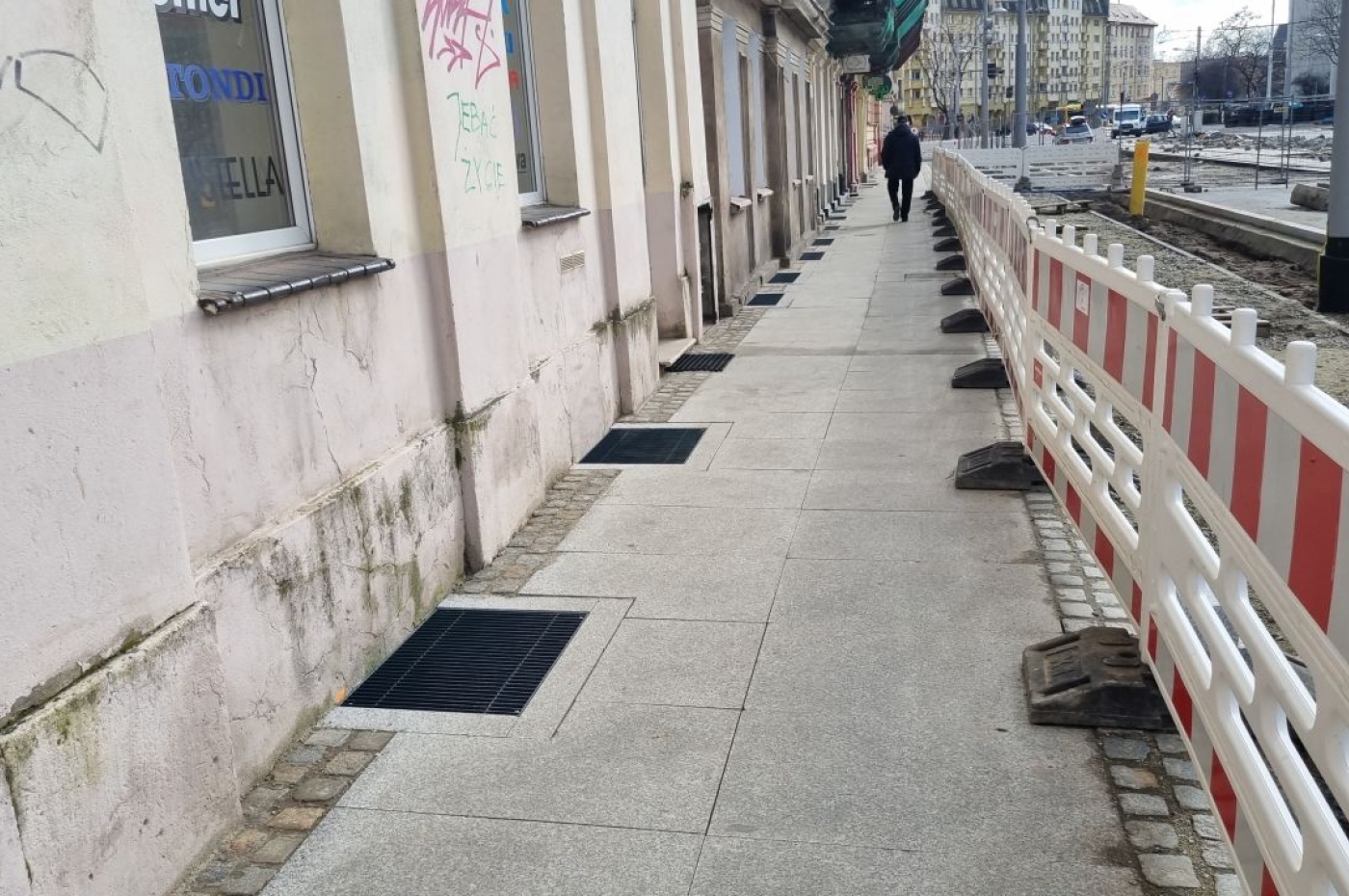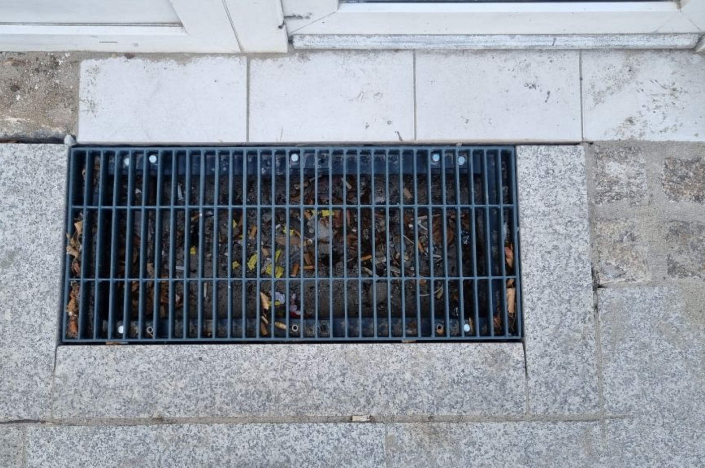 - Krata świetlikowa przykręcana do ramy stalowej kotwionej do obrzeża granitowego, gwarantująca stabilność i przepuszczalność wody.