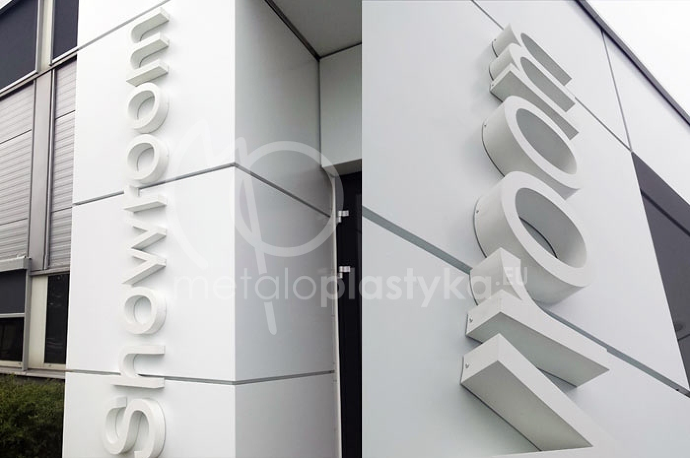 - elewacje biurowców, sklepów, salonów usługowych, gdzie litery przestrzenne z plexi, metalu lub aluminium mogą przedstawiać firmy znajdujące się w budynku,