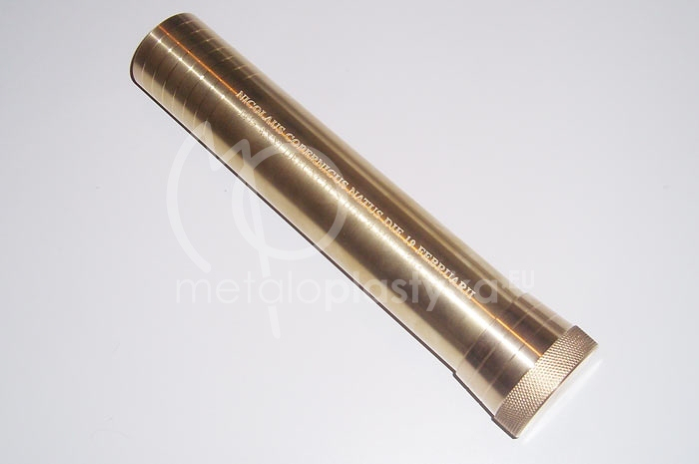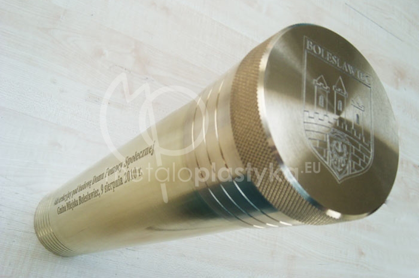 Tuba z mosiądzu w kształcie walca z odkręcaną nakrętką i indywidualnym grawerunkiem przeznaczona na tzw. akt erekcyjny lub kapsułę czasu.