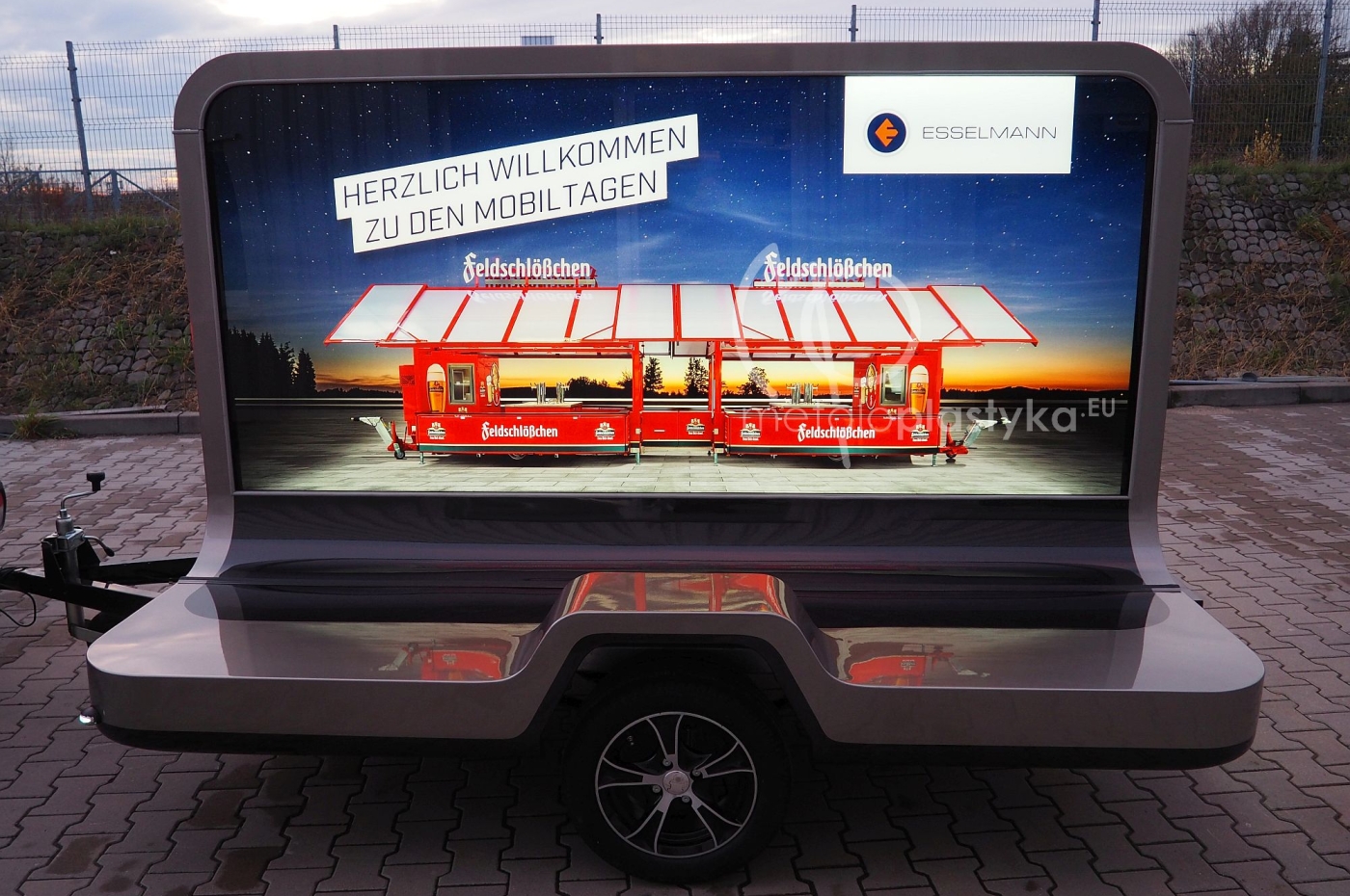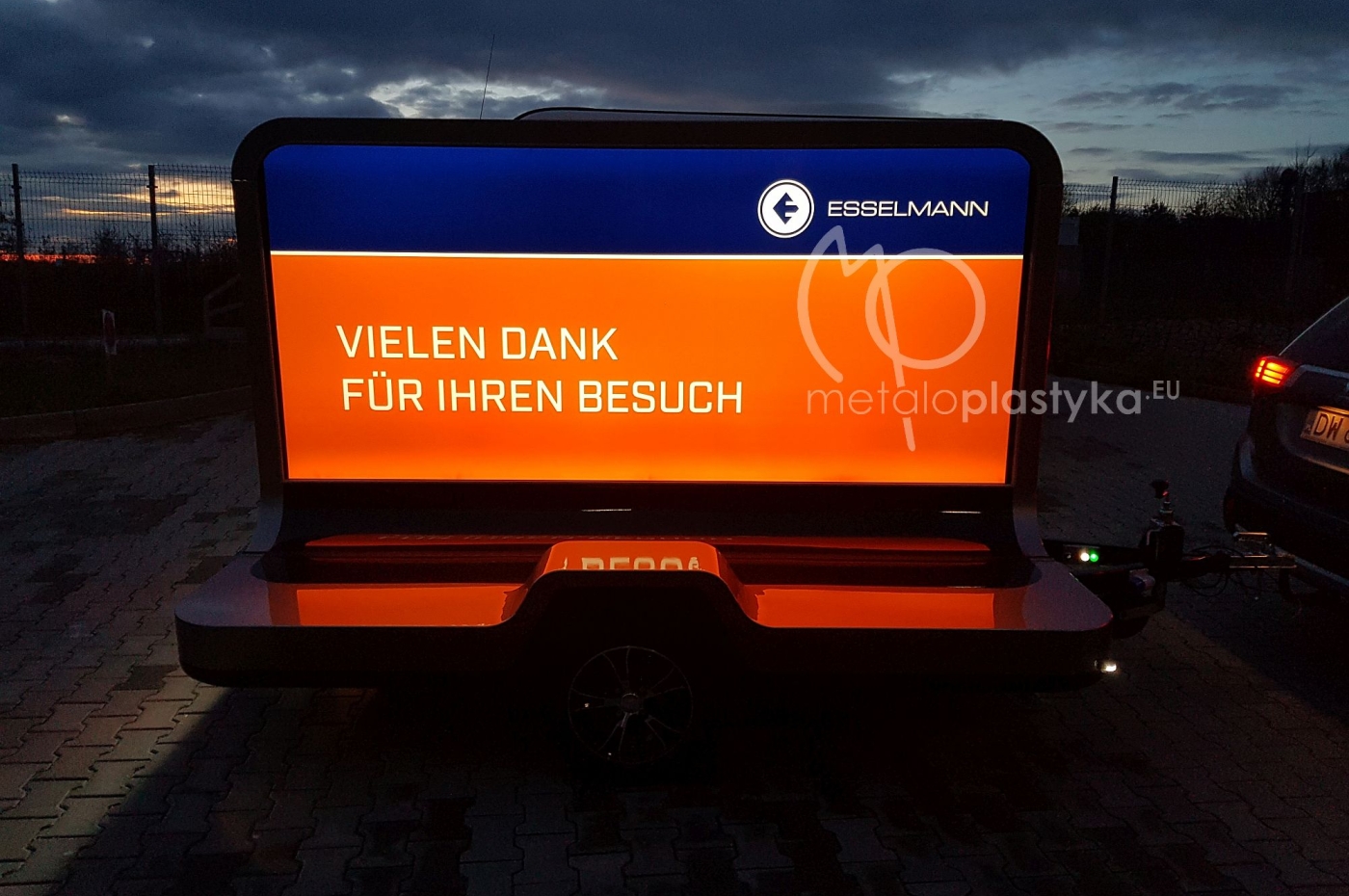 Przyczepa posiada akumulatory do podświetlania reklamy od 8 do 12 godzin z funkcją ładowania w ciągu ok 8 godz.