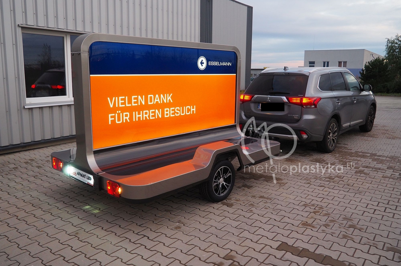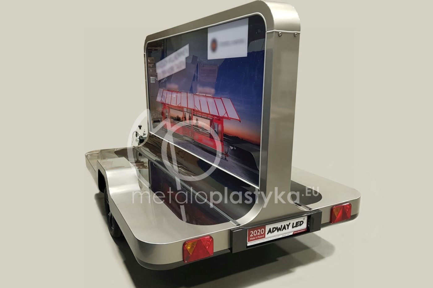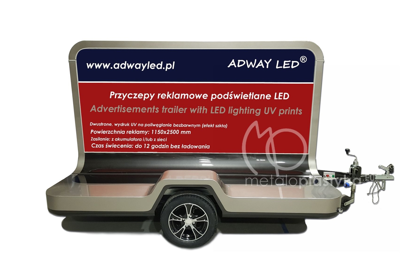 Jeśli poszukujesz przyczepy reklamowej dla marki premium i chciałbyś ją zaprezentować w sposób ekskluzywny, to przyczepa reklamowa ADWAY LED Metaloplastyka jest dla Ciebie. Oferujemy zaprojektowaną przyczepę reklamową podświetlaną LED ], z obustronną grafiką ze specjalnym rodzajem druku, idealnie odwzorowującym kolory po podświetleniu (bez efektu "wypłowiałych kolorów"). Grafika jest wymienna, czyli po kampanii reklamowe bądź informacyjnej jest możliwość łatwej wymiany.