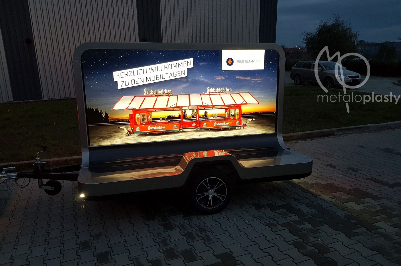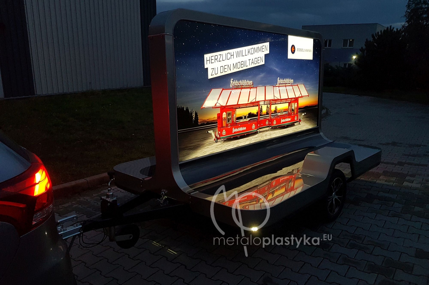 Elegancka przyczepka reklamowa ADWAY Metaloplastyka z dwustronną podświetlaną LED wymienną reklamą.