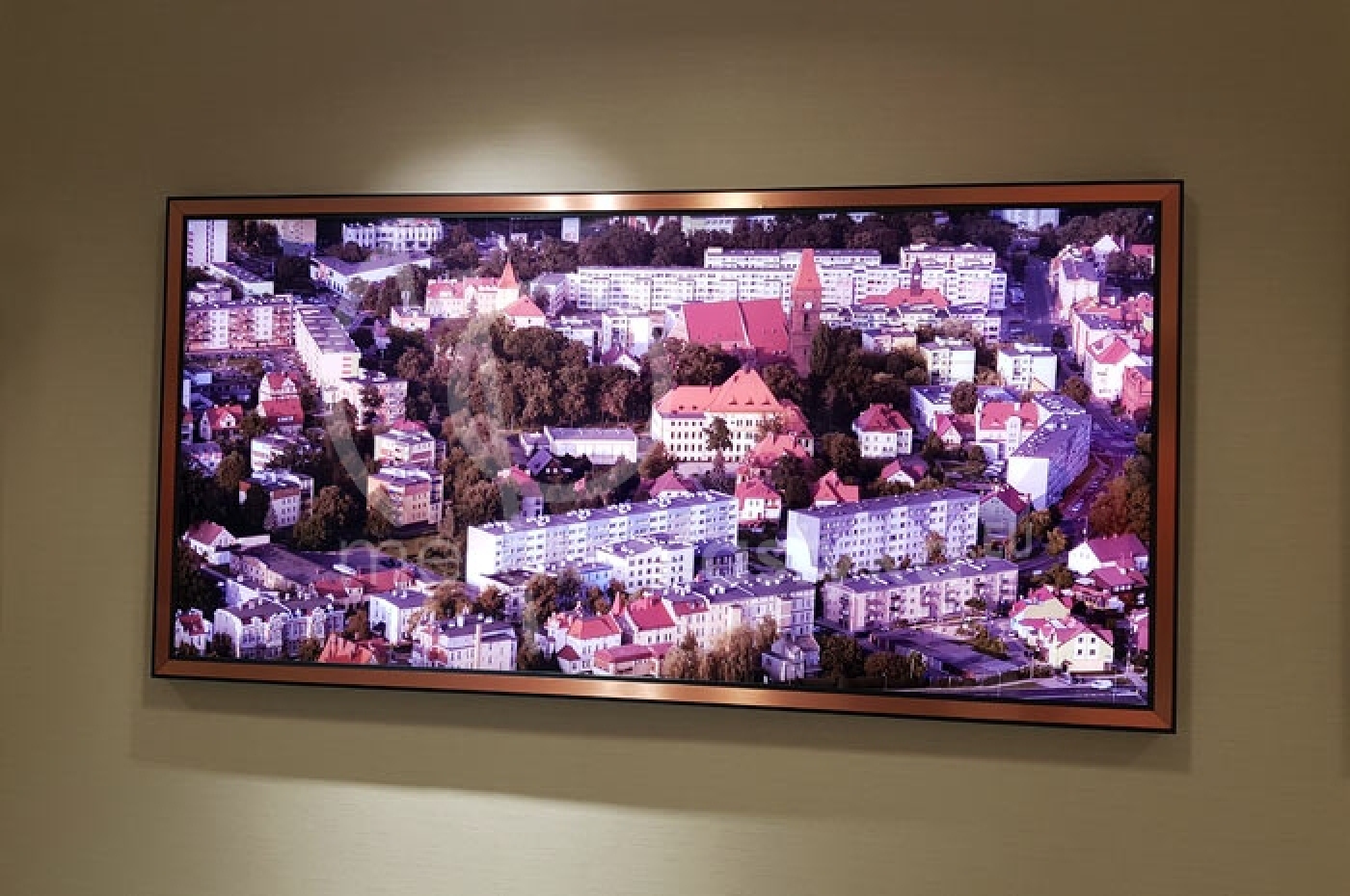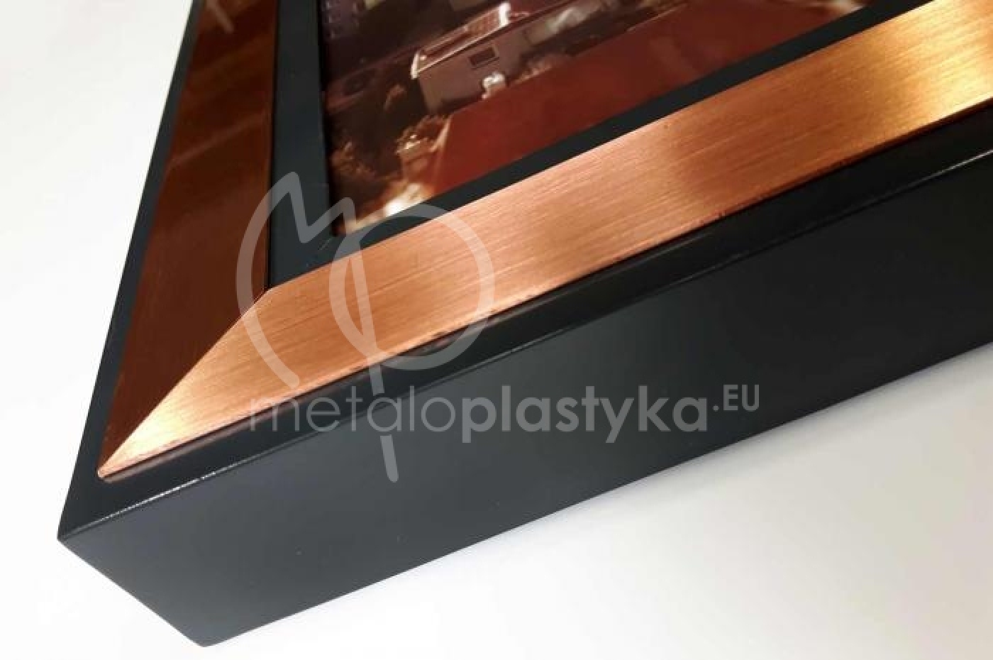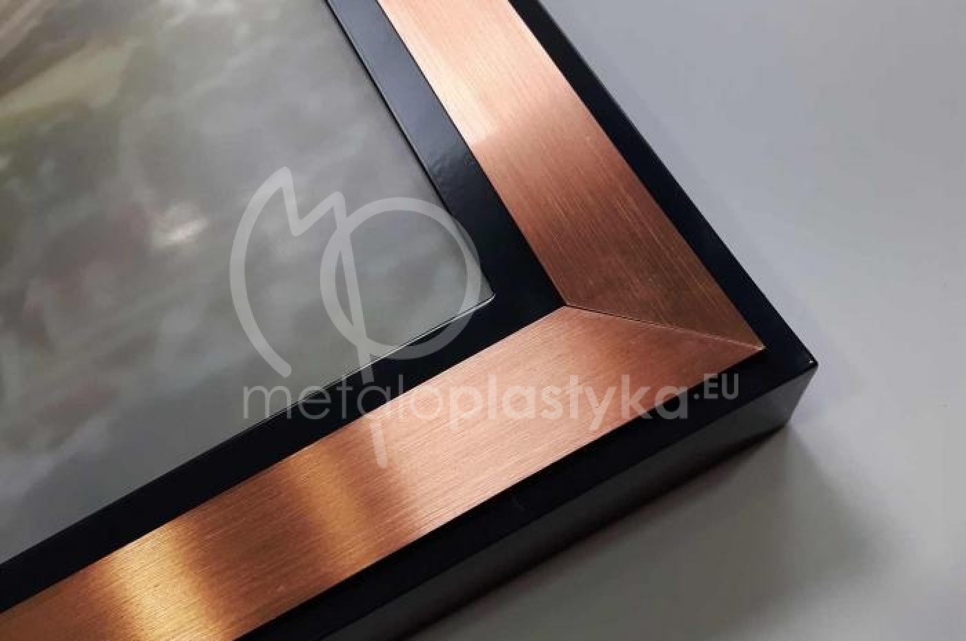 Specjalnie zaprojektowana rama aluminiowa o szerokości 50 mm i wysokości 40 mm, wraz z elementem ozdobnym w postaci paska szczotkowanej miedzi.