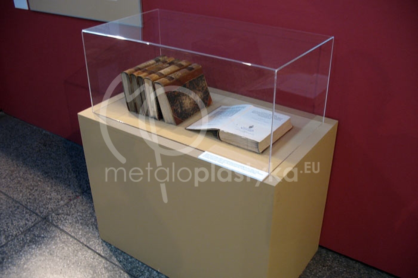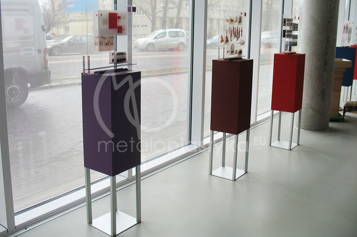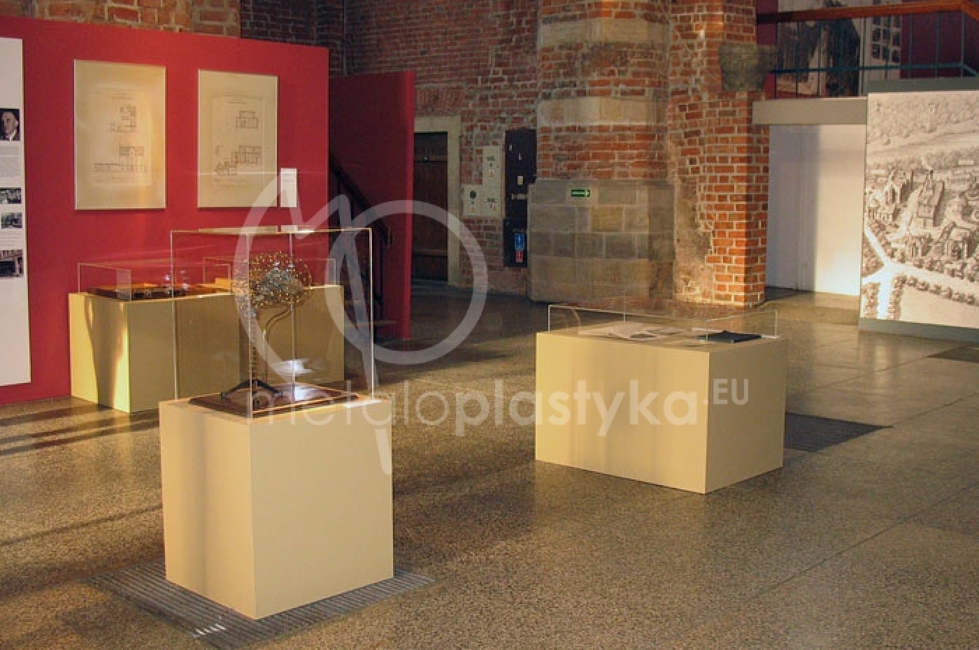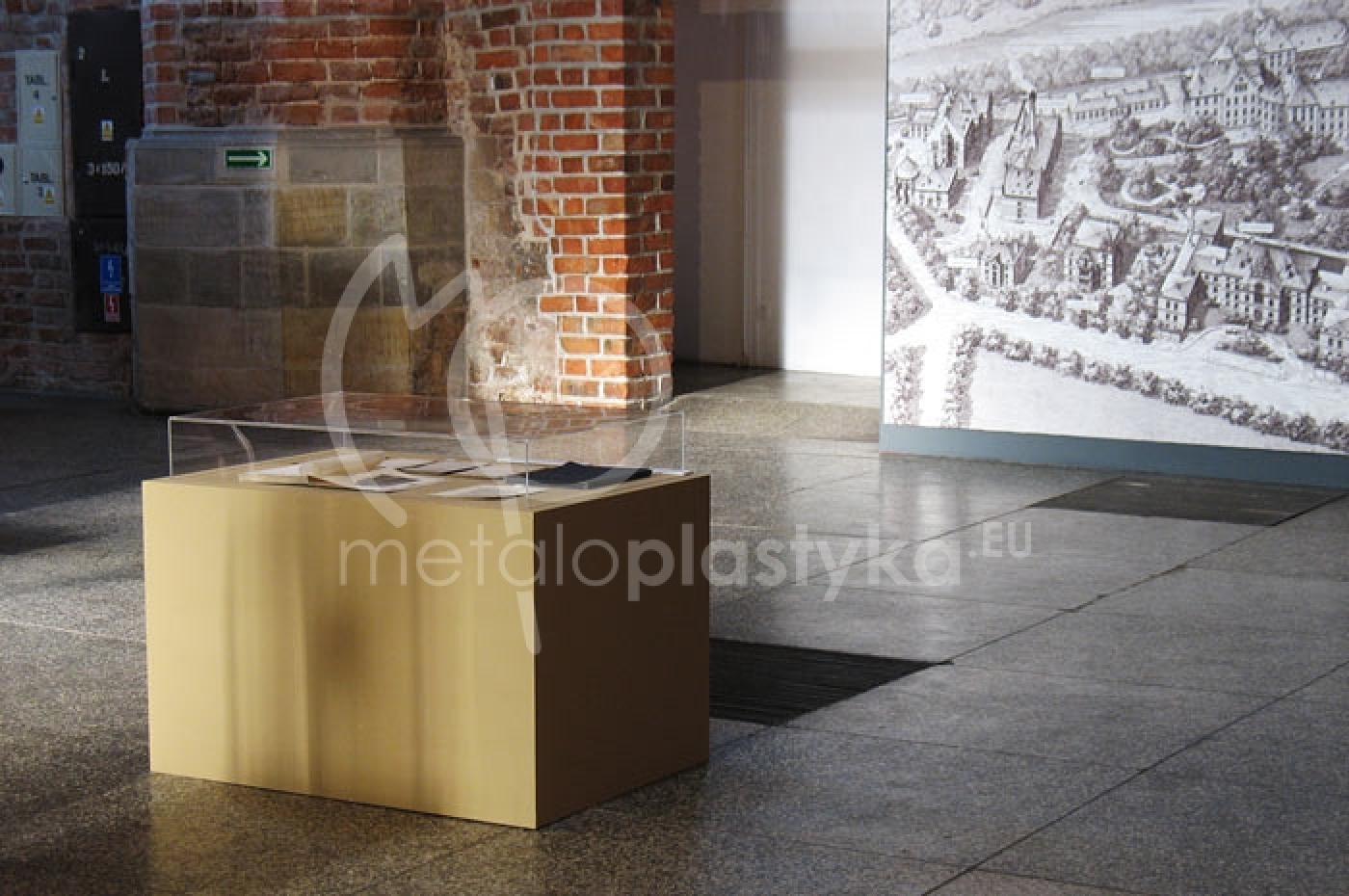 Podesty na eksponaty z obudową z plexi lub szkła. Podest wykonany z metalu lakierowanego proszkowo.