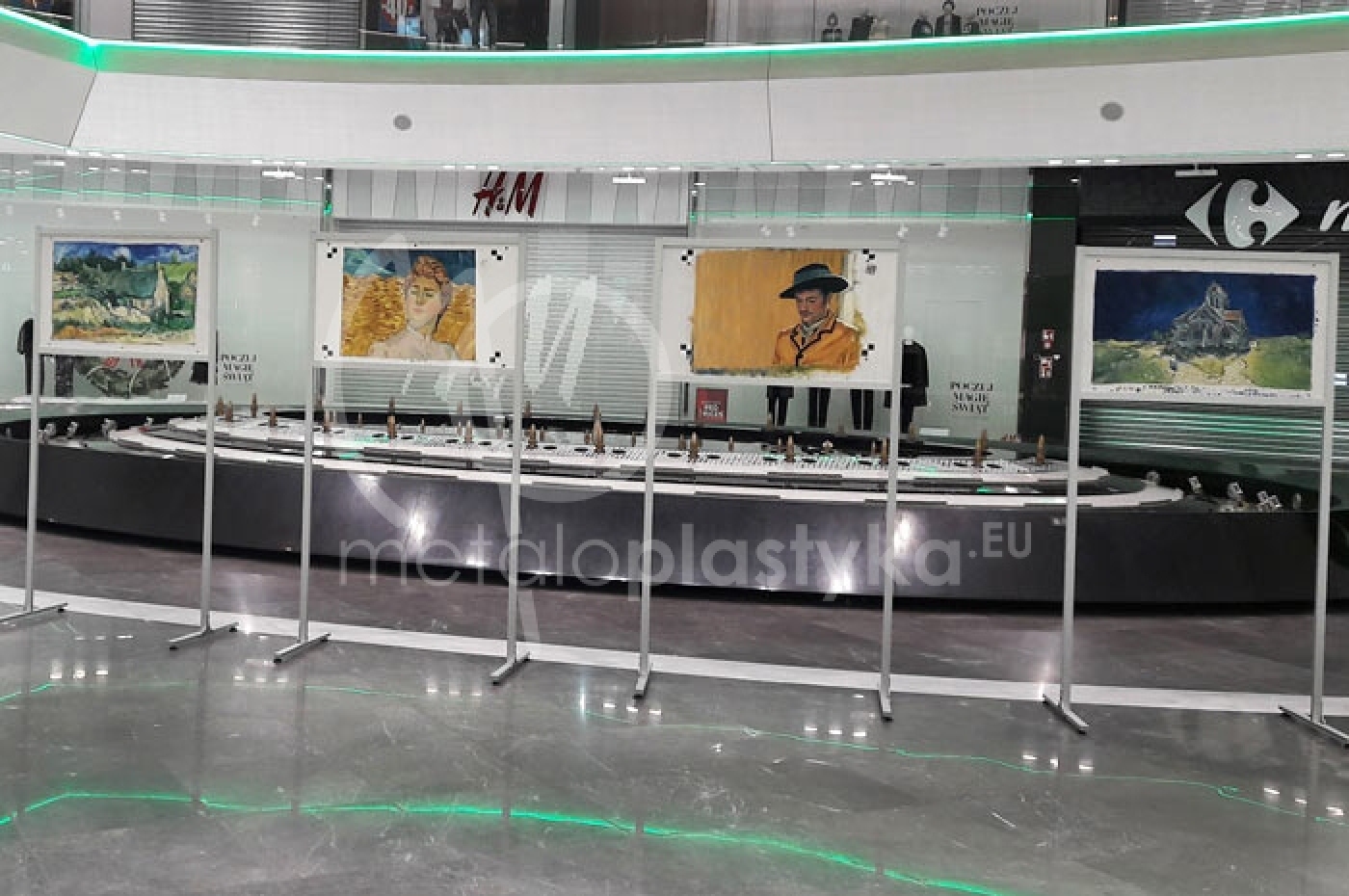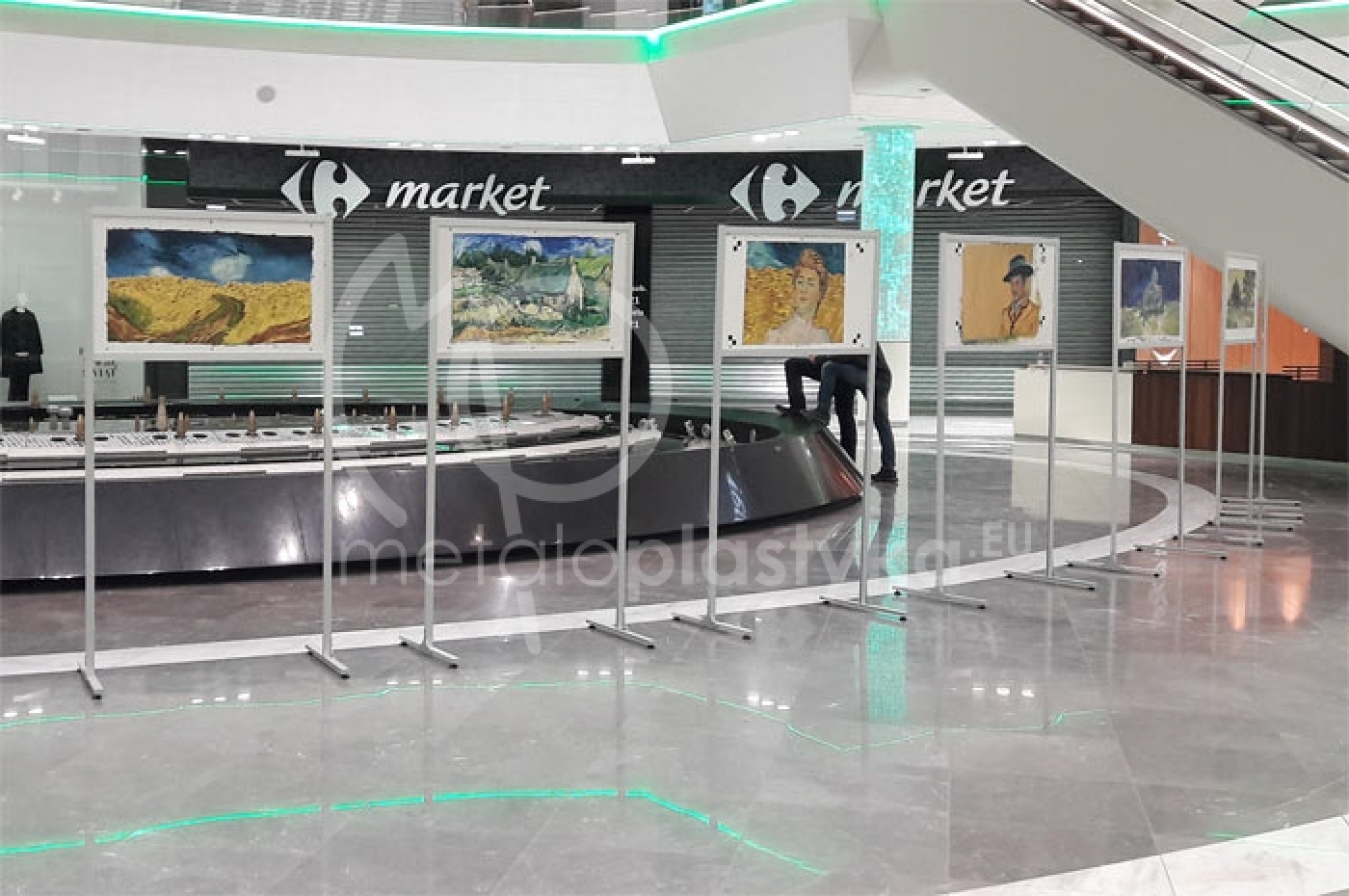 Stelaż z 1 lub 2 ramami zatrzaskowymi, do prezentacji plakatów papierowych lub cienkiego tworzywa o grubości do 1 mm. Konstrukcja spawana z profili aluminiowych, nie jest demontowalna, lekka, nie umożliwia łączenia w ścianki.