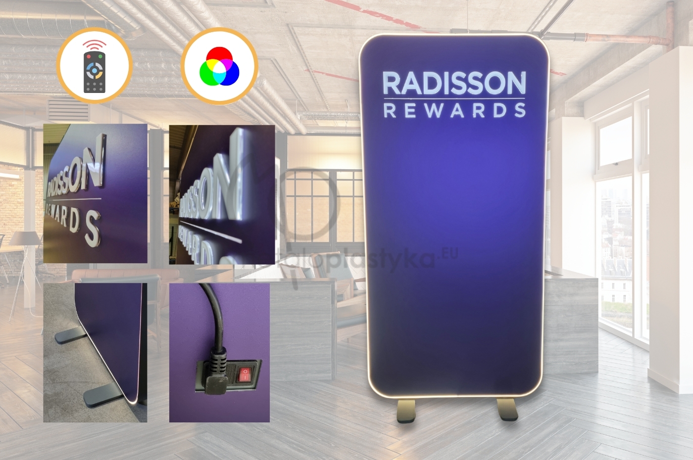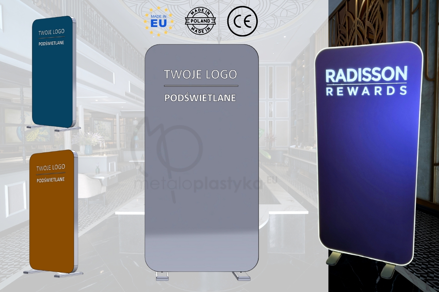 Stojaki reklamowe z podświetlanym logo LED, wewnętrzne, z ekskluzywnym wykończeniem ozdobnymi foliami 3M. Budowa aluminiowo-stalowa, przeznaczone do prezentacji logotypów podświetlanych wypukłych. Idealne do pomieszczeń hotelowych, biurowych, targowych oraz sklepów luksusowych. Mogą pełnić funkcję ścianek prezentacyjnych lub do zdjęć.