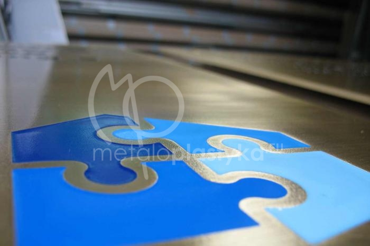 Na zdjęciu dolnym pokazano efekt trawienia w standardzie, tzn. znaki graficzne wgłębione w metalu, tło wypukłe.