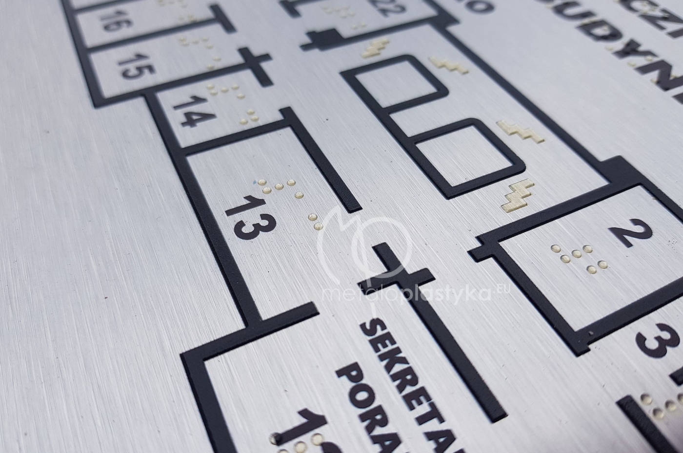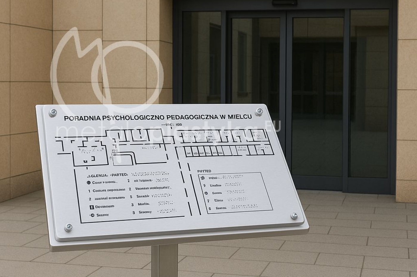 Tablica tyflograficzna z mapą najważniejszych dla osób niewidomych miejsc w budynku wraz z tłumaczeniem na język Breill, wykonanym na płycie kompozytowej przytwierdzonej do postumentu ze stali nierdzewnej. Stojak przykręcany do betonowej podłogi z ukrytymi śrubami.