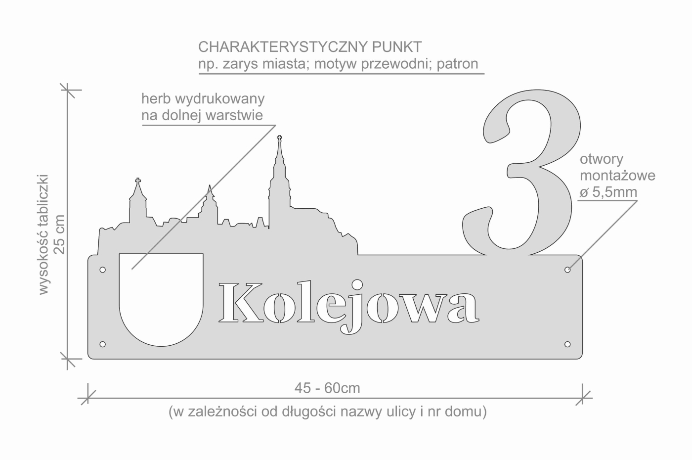 Oferujemy stylową tablica adresowa, w której umieszczamy zarys miejscowości, charakterystyczne miejsce, motyw przewodni. Taki kształt i herb drukowany w kolorze dają efekt idealnego dopasowania do miejsca.