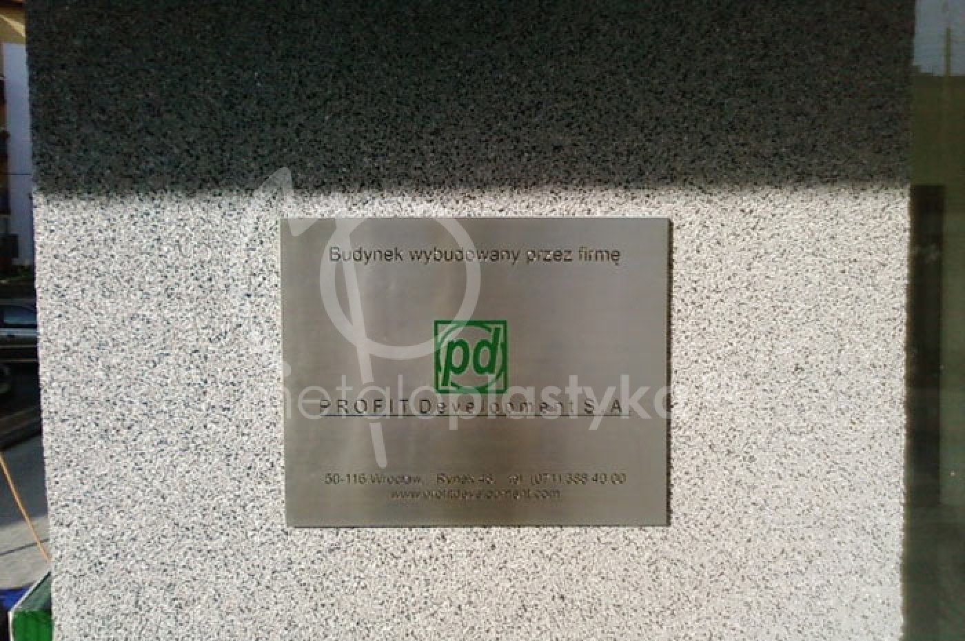 Znaki graficzne wgłębione w metalu, polakierowane utwardzaną farbą.