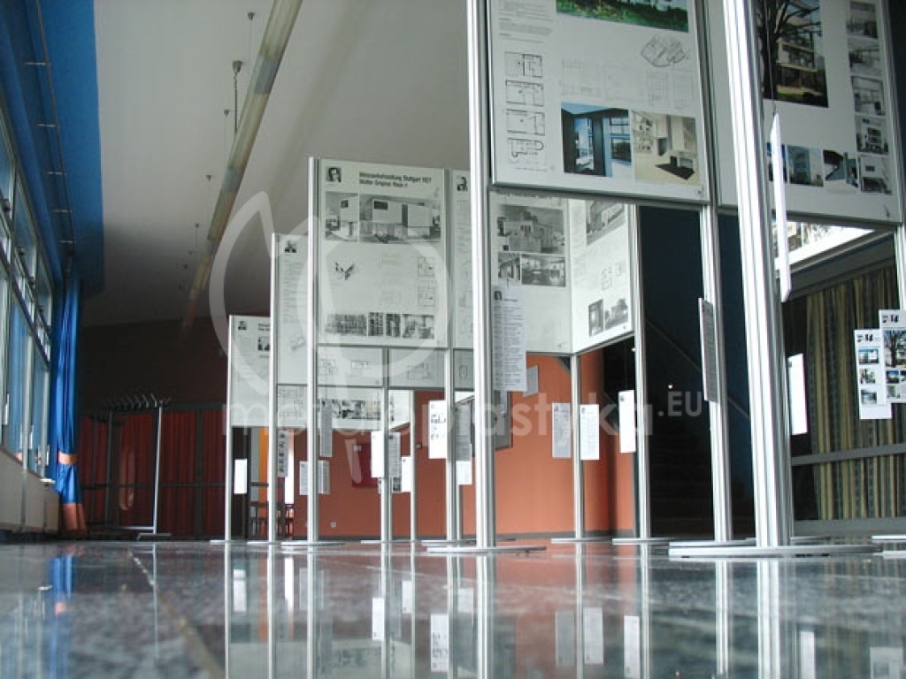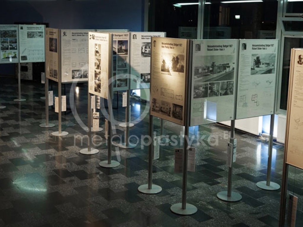 Ekspozycja obrazów oprawionych w ramy aluminiowe profil A (cienki) z licem, zawieszona na stelażach INDOOR A złączonych w nietypowe formy przestrzenne.