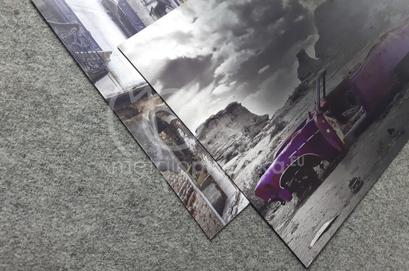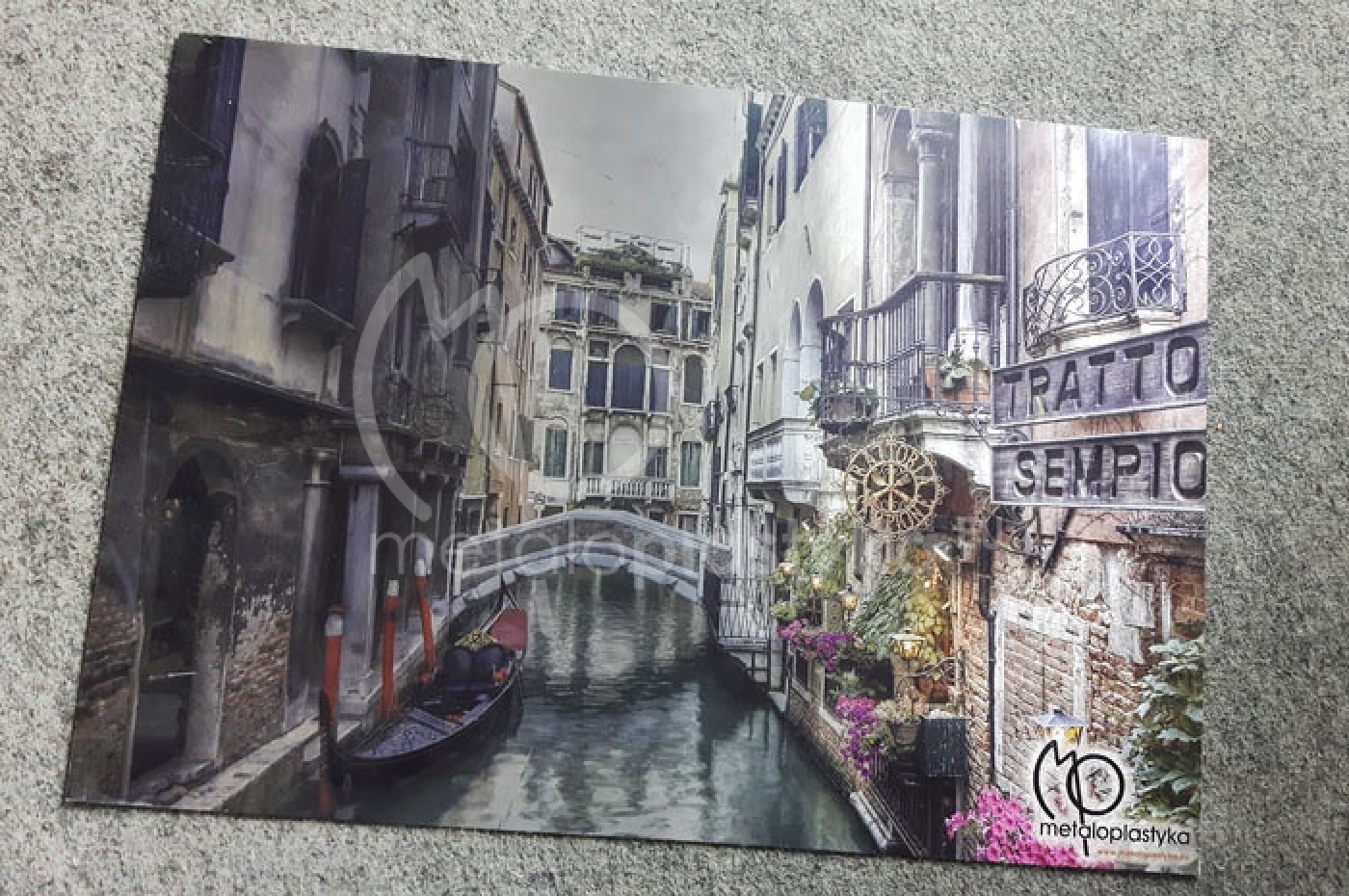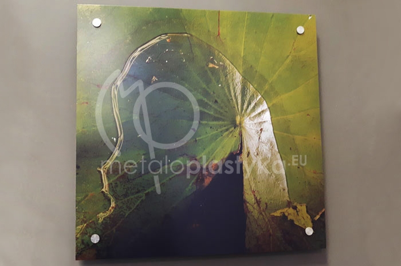 Very interesting effects can be obtained by printing on stainless brushed metal sheets, where the white sections of the design are blank and show the raw brushed metal. This can be used for advertising, souvenirs, memorial plaques and decoration.