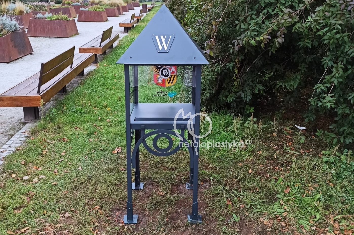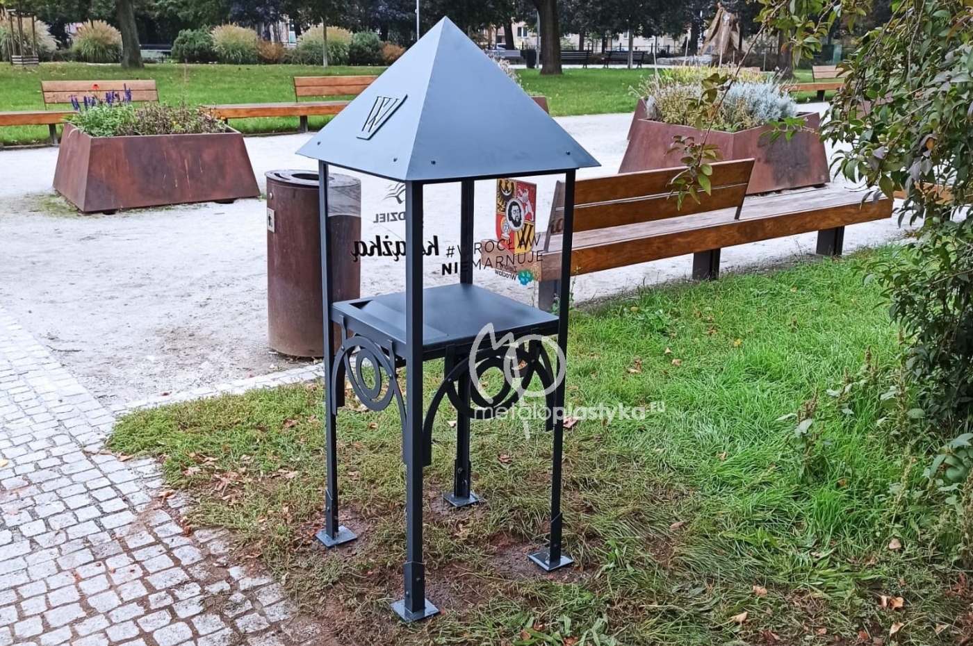 Budki wykonujemy z metalu i aluminium, lakierujemy proszkowo na wybrany kolor RAL (najczęściej antracytowy lub czarny). Boki są wykonywane z bezbarwnego poliwęglanu litego z indywidualnie zaprojektowanym graficznie wydrukiem UV (przygotowujemy projekt na podstawie wytycznych Klienta). Oferujemy również dostawę i montaż.