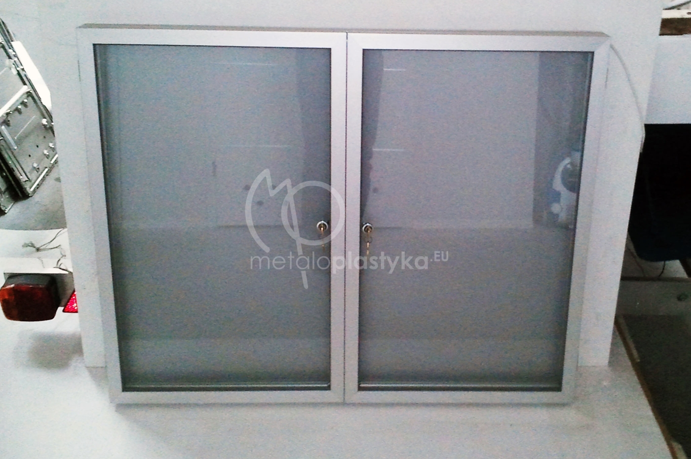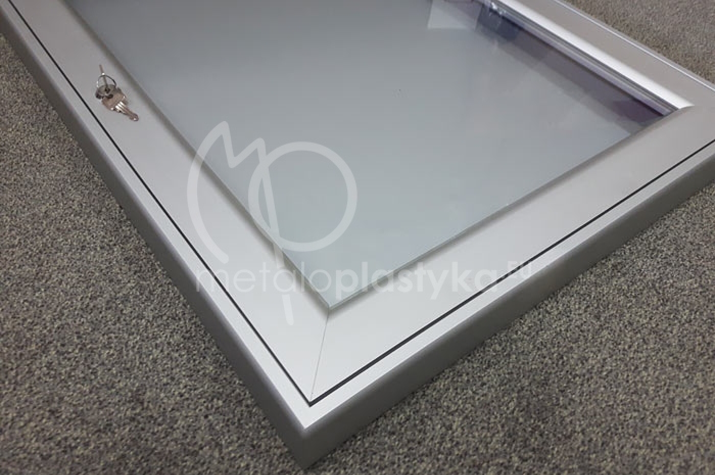 Gablota informacyjna z profili anodowanych srebrnych, z plecami z blachy magnetycznej lub tworzywa, lico drzwi przeszklone lub wypełnione poliwęglanem litym bezbarwnym. Gabloty otwierane do góry lub na bok, z drzwiami pojedynczymi lub podówjnymi. Wymiary dopasowane do potrzeb lub według podanych standardów.