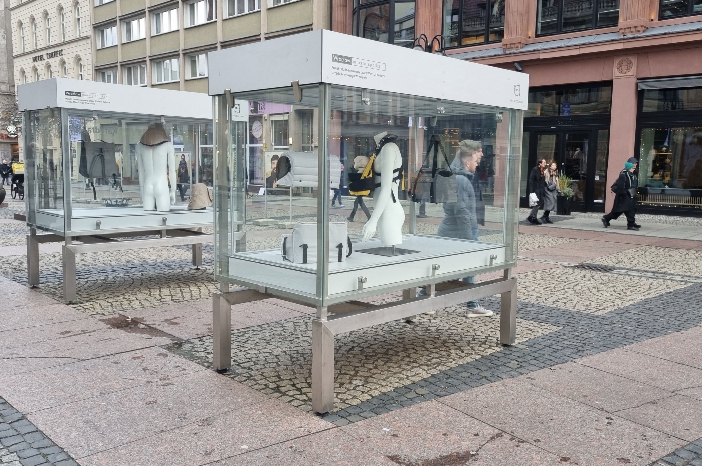 Gablota ekspozycyjna wyprodukowana na podstawie projektu Akademii Sztuk Pięknych we Wrocławiu.