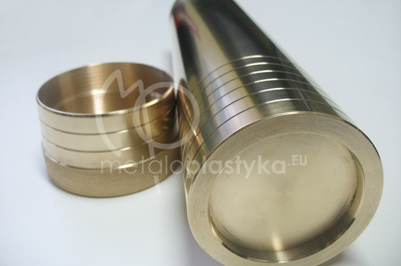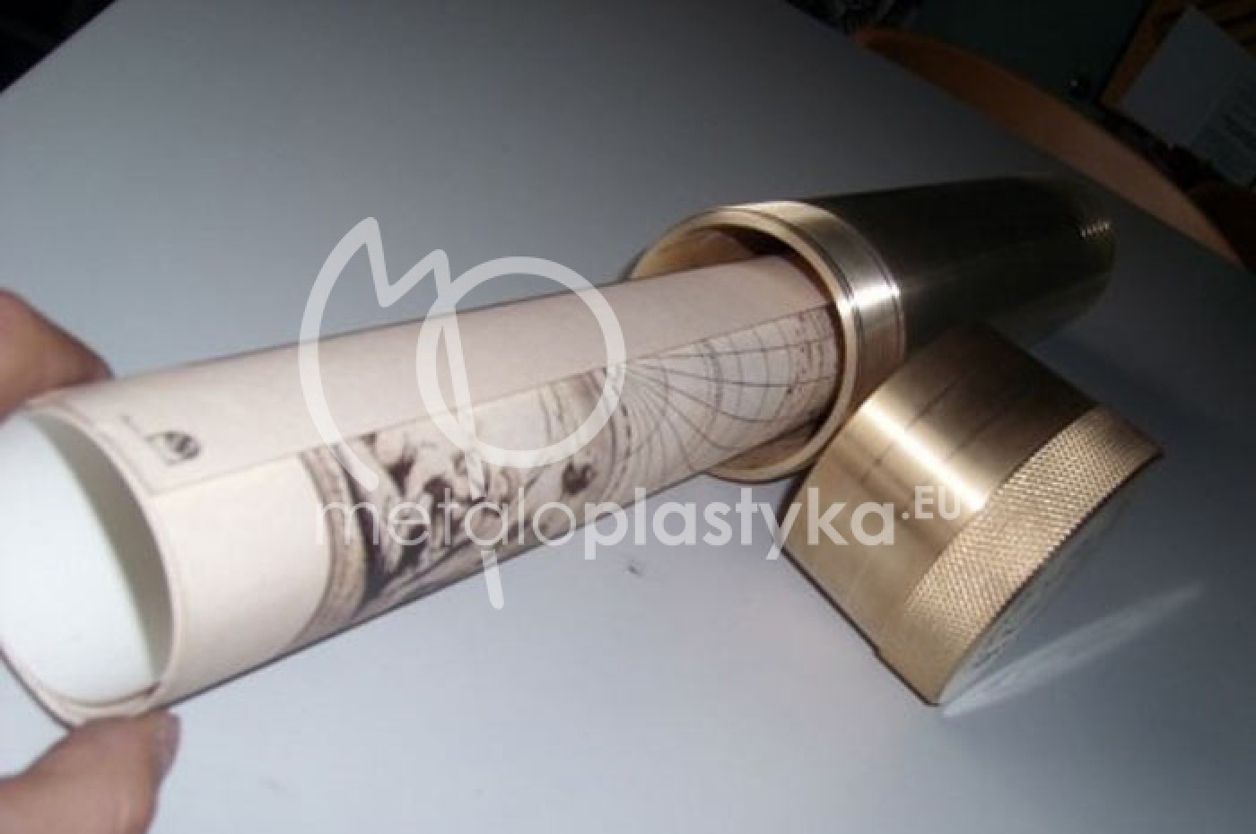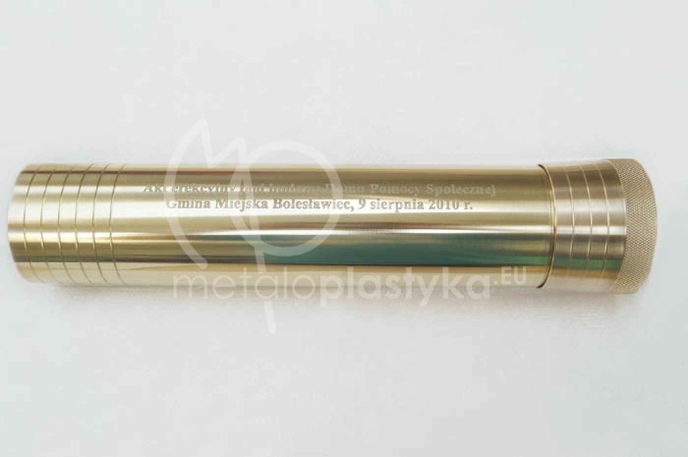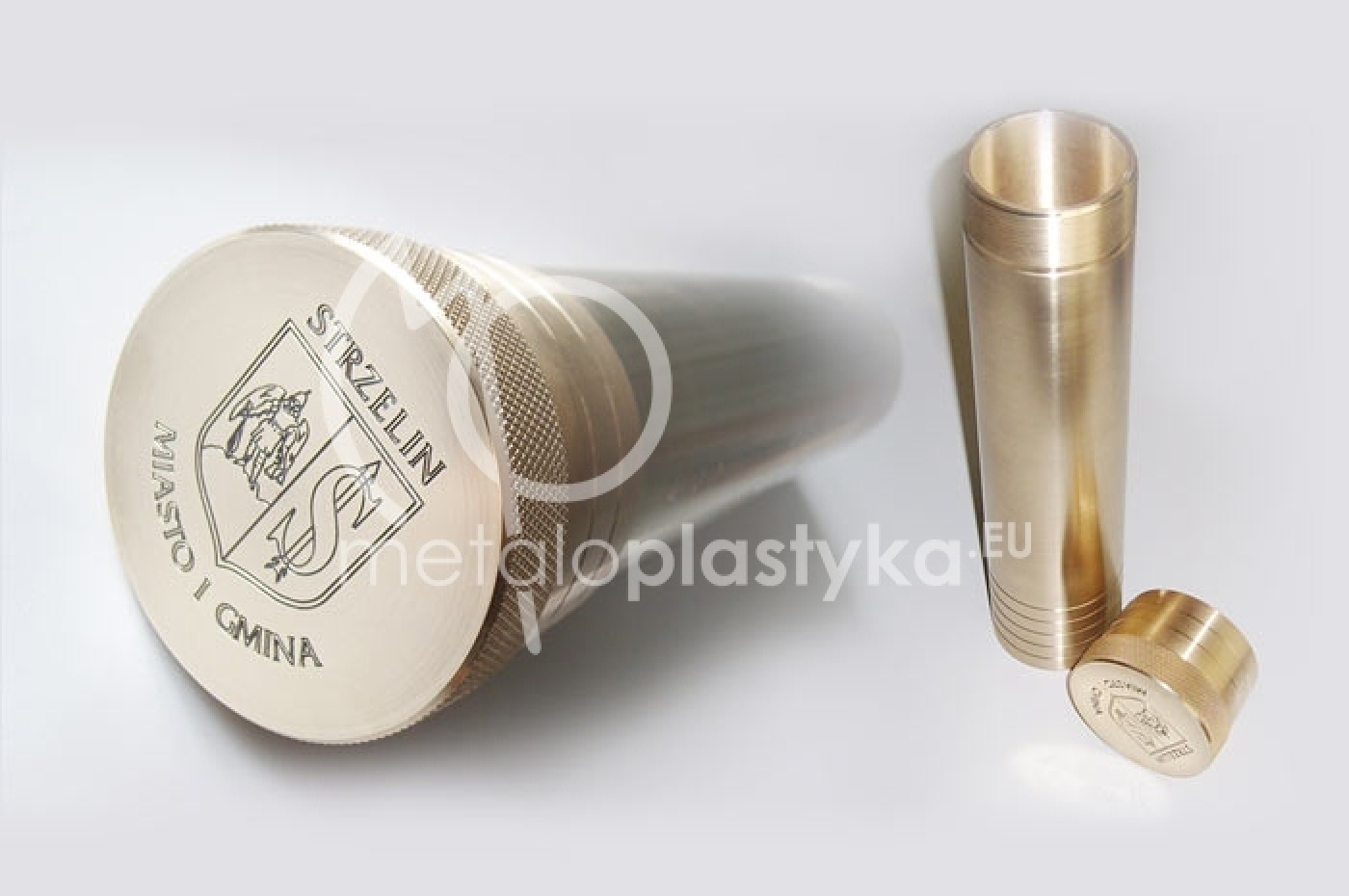 Tuba z mosiądzu w kształcie walca z odkręcaną nakrętką i indywidualnym grawerunkiem przeznaczona na tzw. akt erekcyjny lub kapsułę czasu.