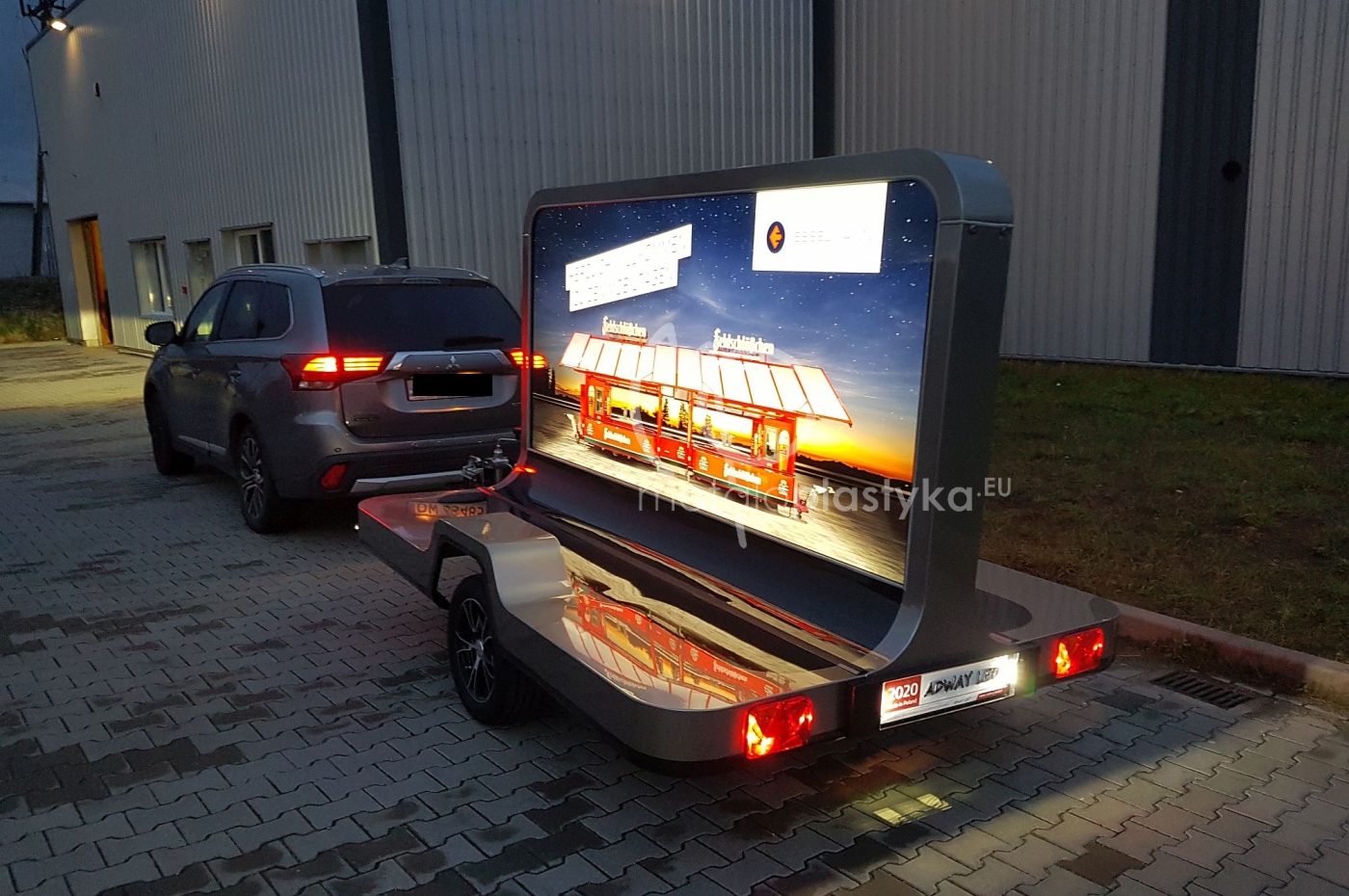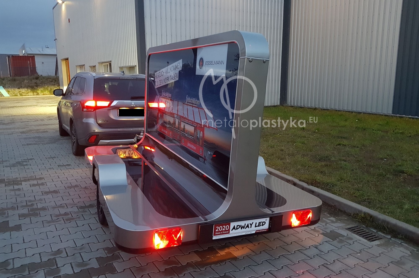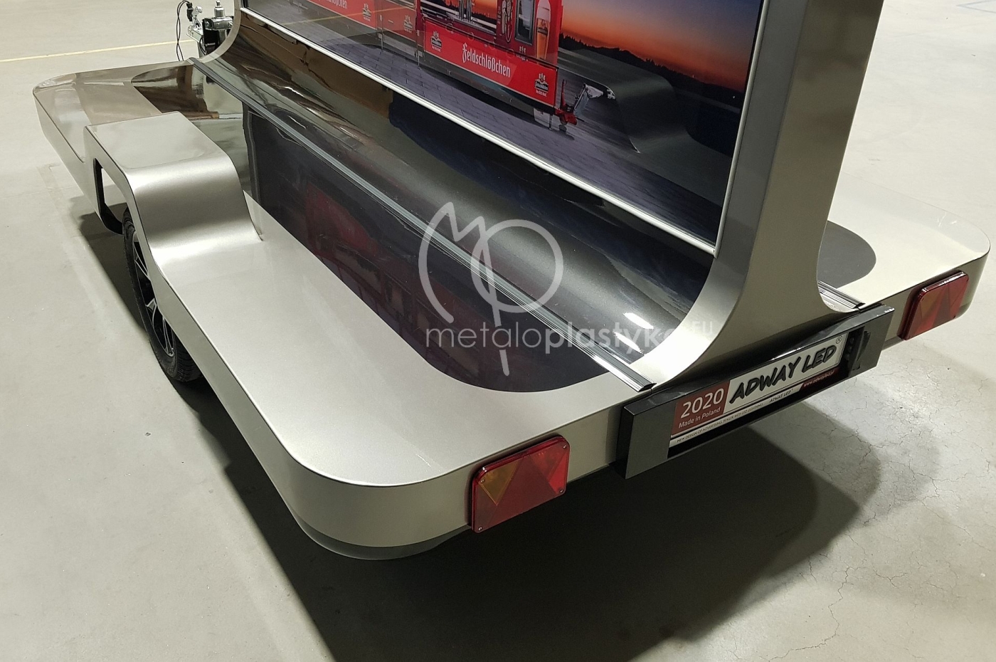 Jeśli poszukujesz przyczepy reklamowej dla marki premium i chciałbyś ją zaprezentować w sposób ekskluzywny, to przyczepa reklamowa ADWAY LED Metaloplastyka jest dla Ciebie. Oferujemy zaprojektowaną przyczepę reklamową podświetlaną LED ], z obustronną grafiką ze specjalnym rodzajem druku, idealnie odwzorowującym kolory po podświetleniu (bez efektu "wypłowiałych kolorów"). Grafika jest wymienna, czyli po kampanii reklamowe bądź informacyjnej jest możliwość łatwej wymiany.