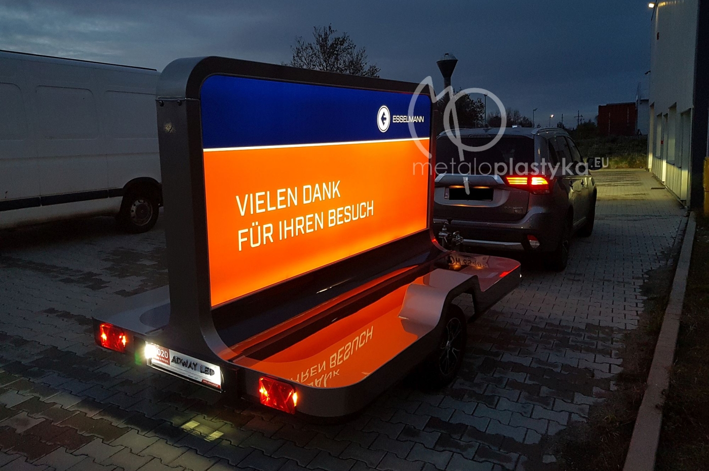 Elegancka przyczepka reklamowa ADWAY Metaloplastyka z dwustronną podświetlaną LED wymienną reklamą.