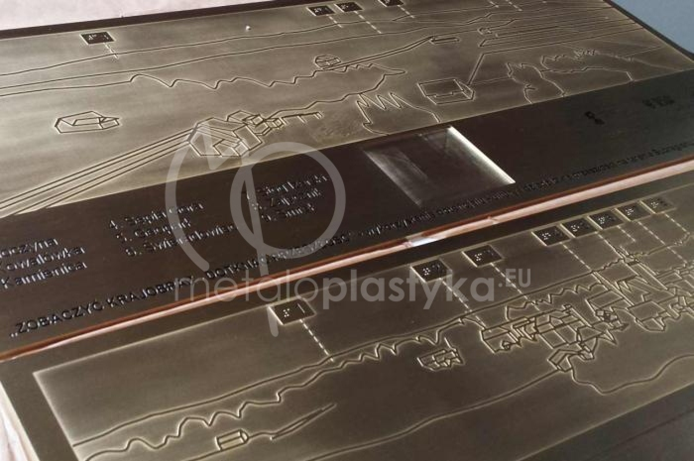 Na zdjęciu dolnym pokazano efekt trawienia w standardzie, tzn. znaki graficzne wgłębione w metalu, tło wypukłe.