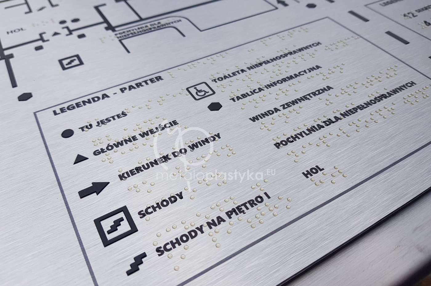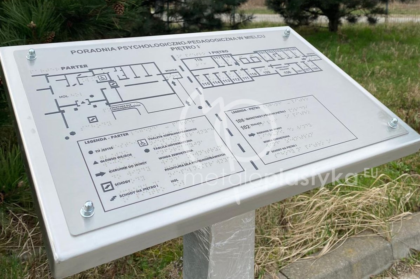 Tablica tyflograficzna z mapą najważniejszych dla osób niewidomych miejsc w budynku wraz z tłumaczeniem na język Breill, wykonanym na płycie kompozytowej przytwierdzonej do postumentu ze stali nierdzewnej. Stojak przykręcany do betonowej podłogi z ukrytymi śrubami.
